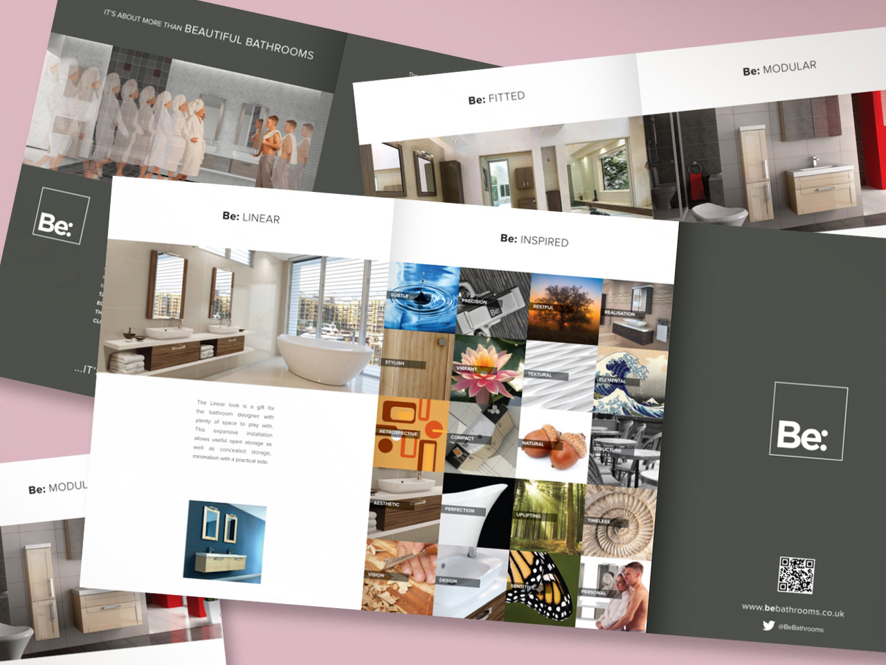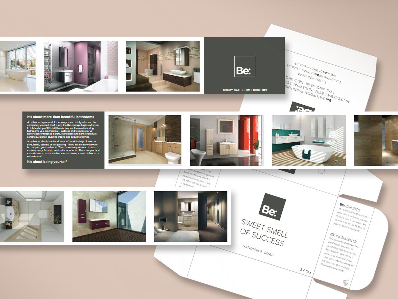 A comprehensive catalogue incorporating dimensions and finishes, various sales leaflets and a special promotional soap box with bar of debossed Be: soap, were created and produced for the Be Modern Group, makers of luxury bathroom furniture and accessories.
