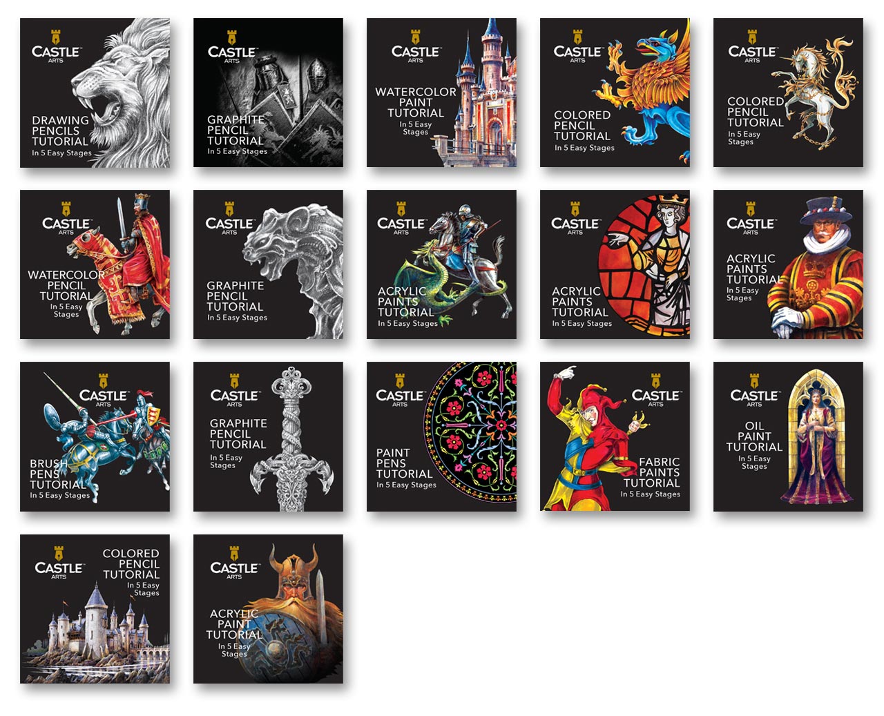 Ongoing design for the product packaging, tutorial literature, and marketing materials for Castle Arts, an arts media manufacturer, involves a blend of aesthetics, know-how, functionality, and brand representation.