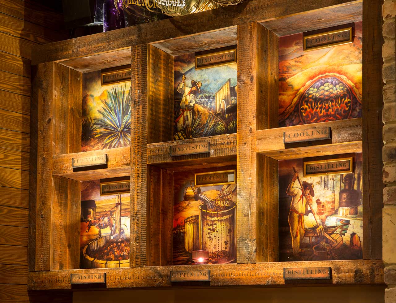 Boxed wood Mezcal wall display in situ.