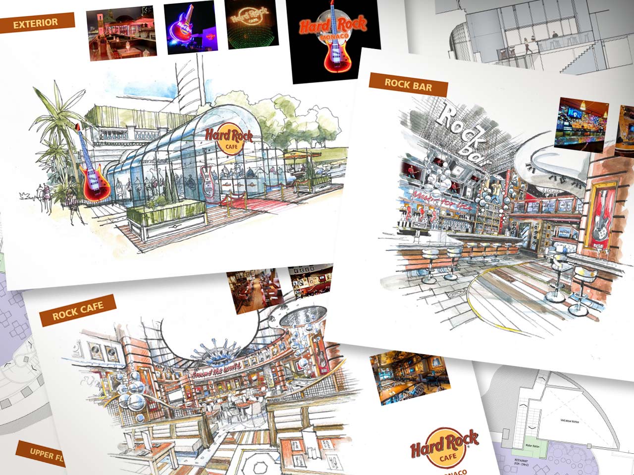 Conceptual visual materials from hand-drawn artist’s impressions to more detailed CGI renderings were prepared, as well as the creation of a ‘hybrid’ Hard Rock Monaco brand.