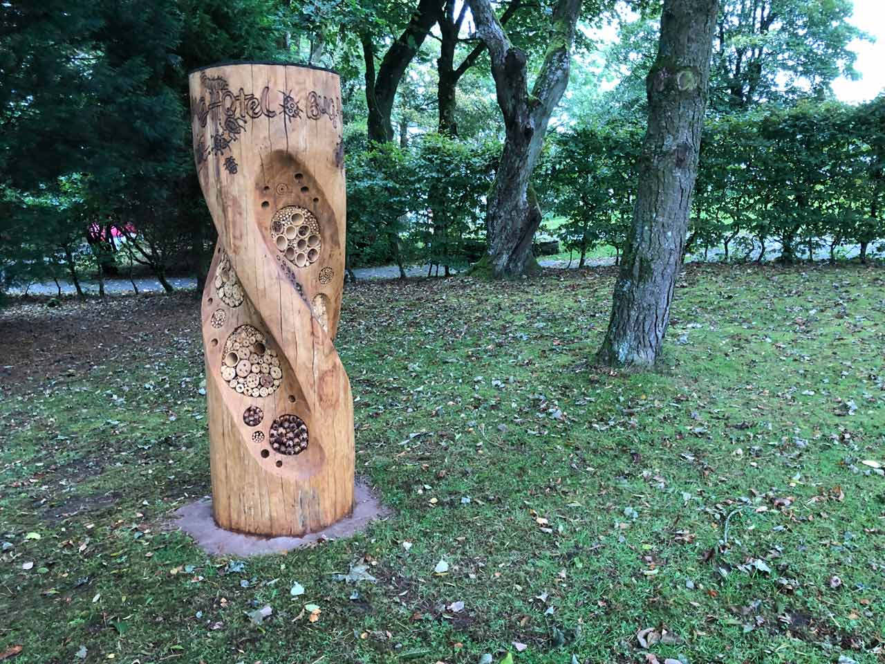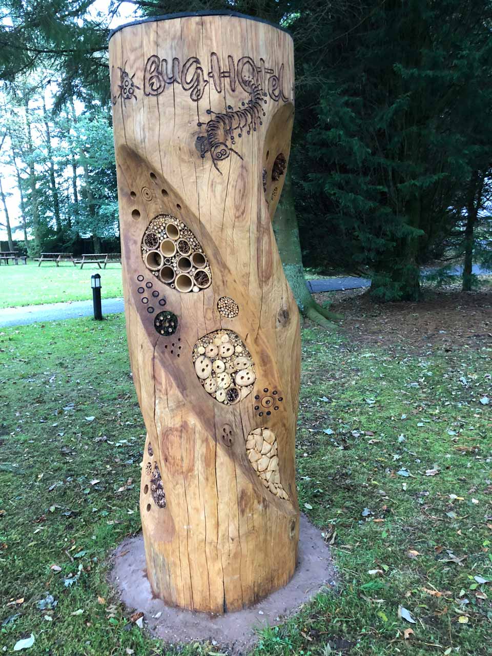 And for something a little more unusual… the Bug Hotel is a log sculpture carved from a solid tree trunk into which many little insect-friendly compartments, recesses and drill holes have been fashioned to encourage the inhabitation of wiggly bugs.