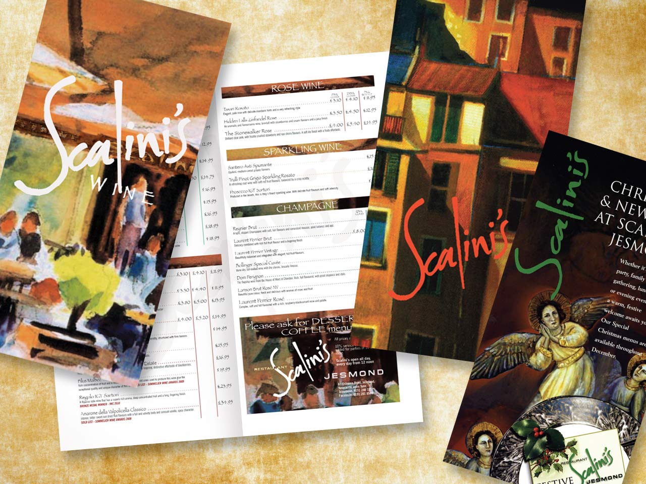 A rustic-themed restaurant serving up Italian and Mediterranean cuisine, Scalini’s was located along the wine bar strip of Osborne Road, Newcastle upon Tyne. Our involvement included the design of a whole range of menus and promotional literature, the main focus of which were several specially-created illustrations in an Italian/Mediterranean style. A celebratory cartoon depicting the members of staff, management and friends was also commissioned.
