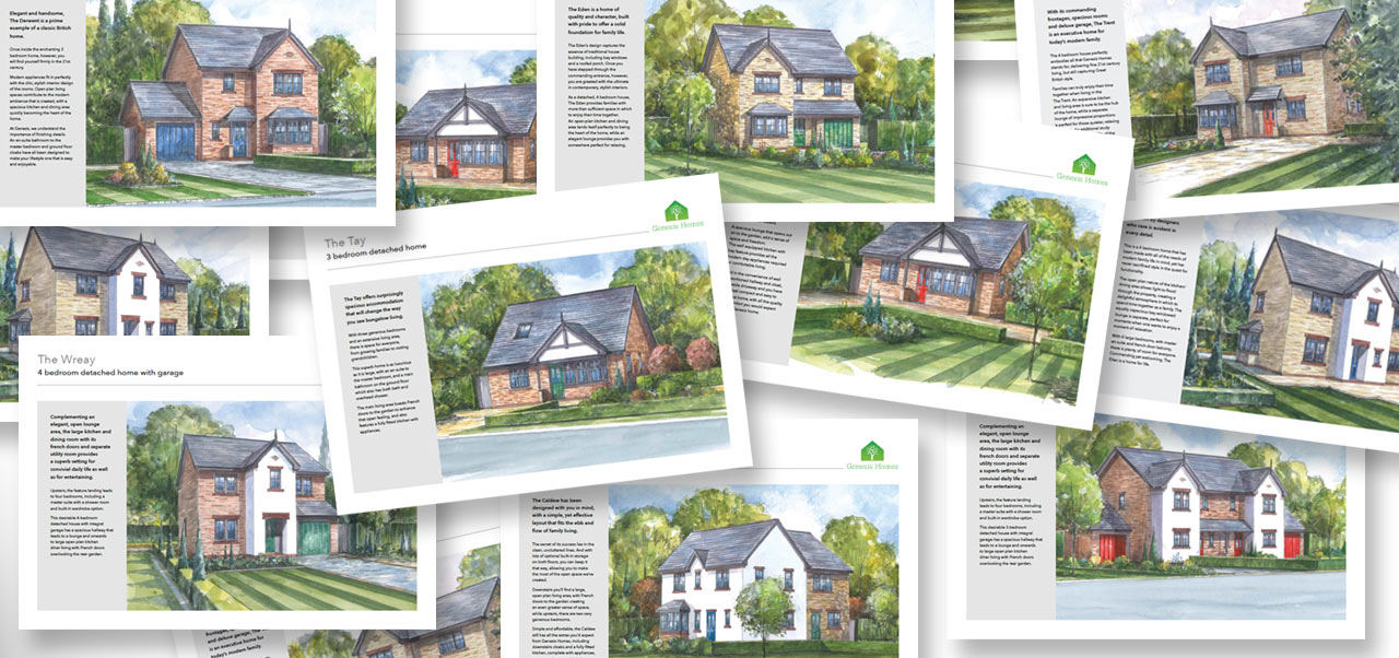 Watercolour illustrations were produced to show off the various house types as well as aerial views to suggest the finished development.