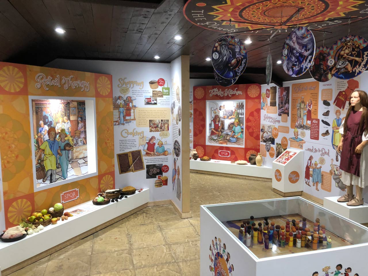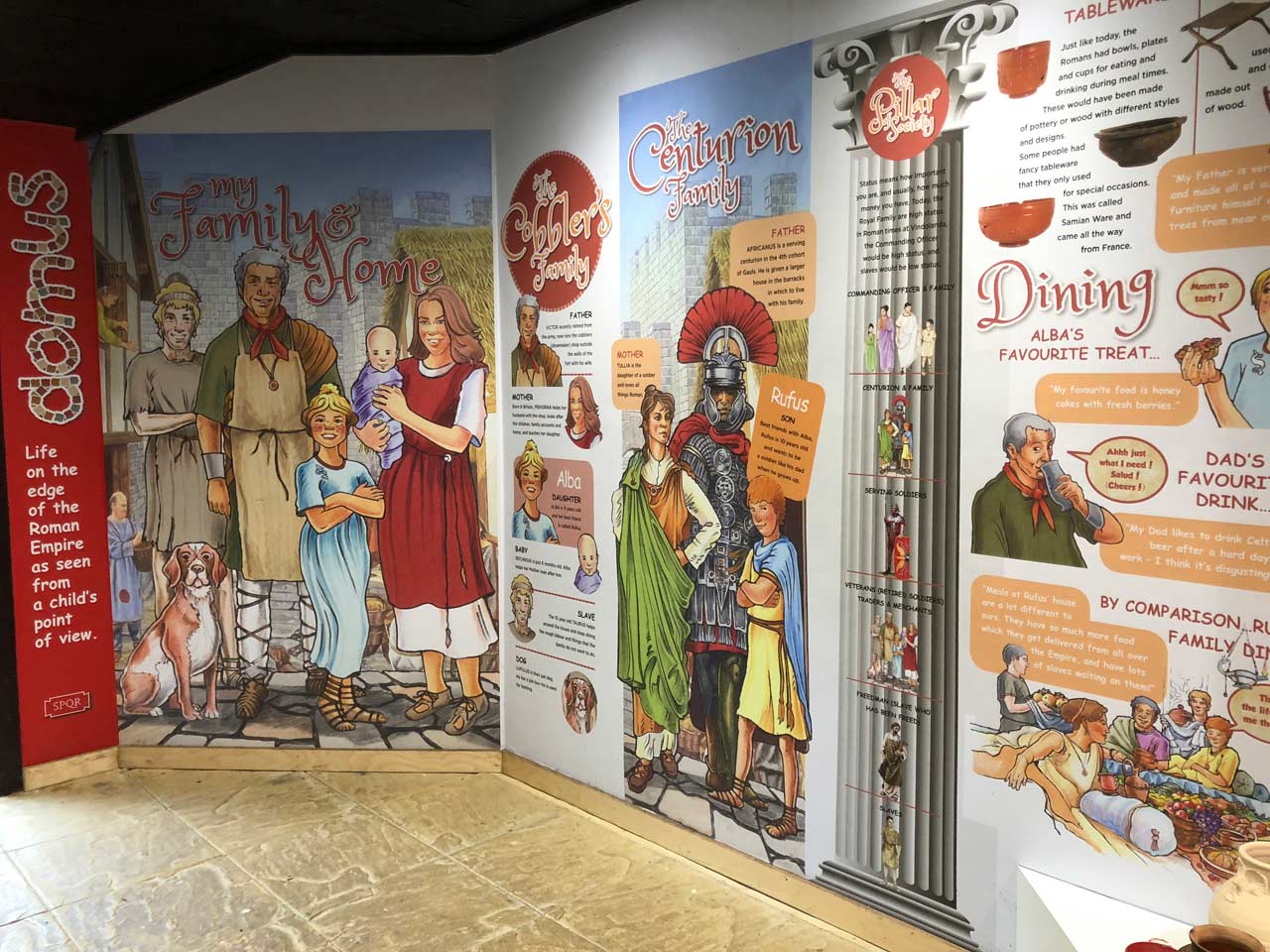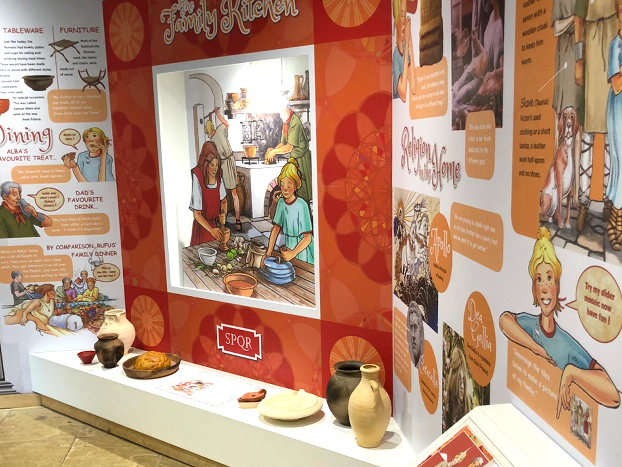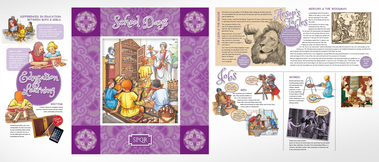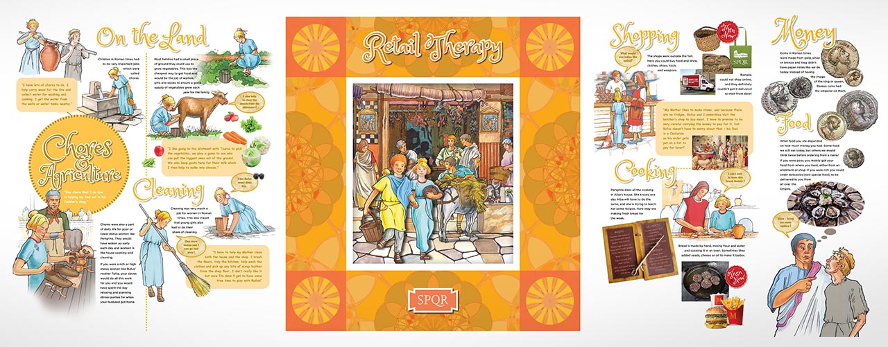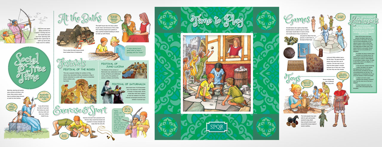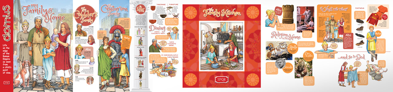 The many topics and aspects of Roman life featured include: Family life, Social and playtime, Education, Eating and drinking, Home life, and Cooking.
